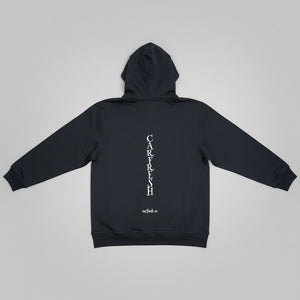 Svart Carfresh T-shirt med litet brösttryck i vitt och stort tryck längs med ryggraden också vitt.